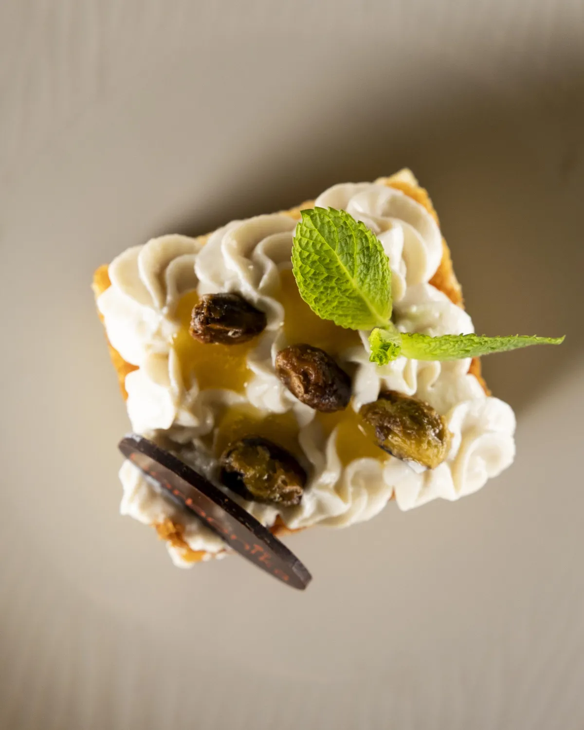 La frolla è croccante, mentre la mousse di cioccolato fondente è vellutata e cremosa. Il cuore di pistacchio aggiunge una consistenza morbida e ricca, contrastata dalla glassa specchio liscia.
